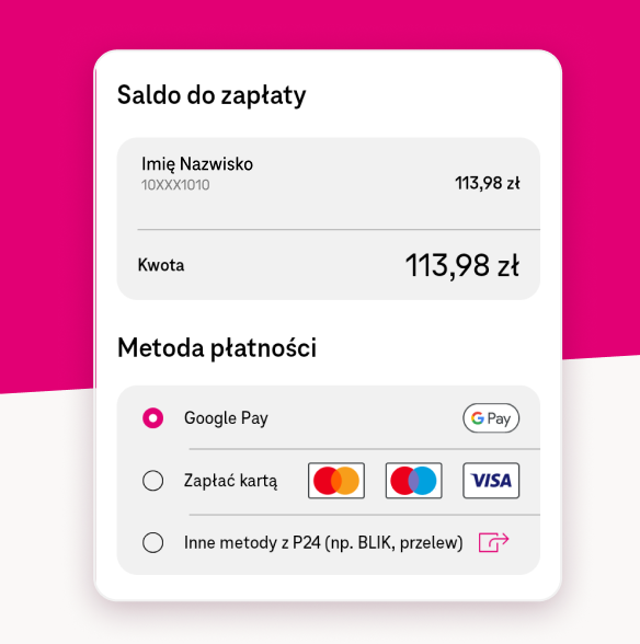 - Wybierz metodę płatności: Karta płatnicza, Google Pay, Apple Pay, BLIK, przelew online lub dodanie do abonamentu