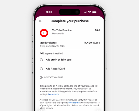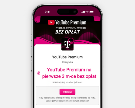 YouTube Premium na pierwsze 3 miesiące bez opłat- okres próbny za 0 zł (potem opłata mies. za subskrypcję) w oparciu o voucher w aplikacji Mój T-Mobile w programie Magenta Moments, z aktywną ofertą GO! XL za 50 zł co 30 dni, kontem YouTube oraz samodzielną aktywacją. Oferta jednorazowa dla nowych, pełnoletnich użytkowników, niekorzystających wcześniej z żadnych subskrypcji YouTube. Anulowanie subskrypcji możliwe w dowolnym momencie. Szczegóły w odpowiednich regulaminach, na www.t-mobile.pl oraz w aplikacji Mój T-Mobile.