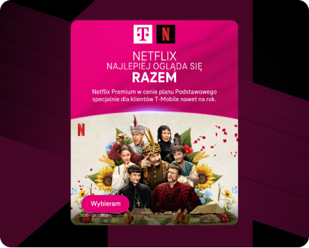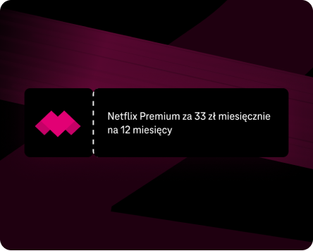 Promocja dla abonentów T-Mobile z taryfą T, uczestników Magenta Moments. Oferta jednorazowa dla numeru telefonu; okres promocyjny zależy od nieprzerwanego trwania umowy na dany numer konsumenta w ofercie abonamentowej: 0-5 lat: 6 mies., 6-14 lat: 9 mies., 15+ lat: 12 mies. Potem opłata zgodnie z cennikiem Netflix Premium. Szczegóły w regulaminie, aplikacji Mój T-Mobile i na www.t-mobile.pl